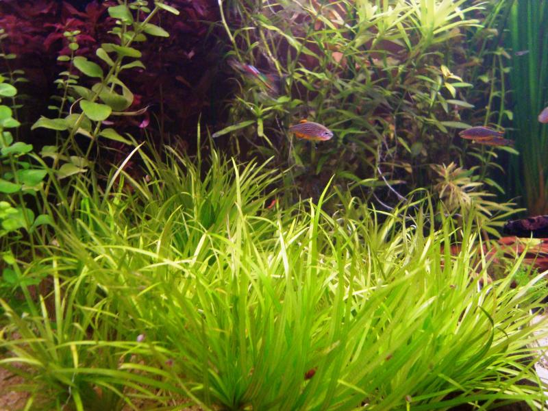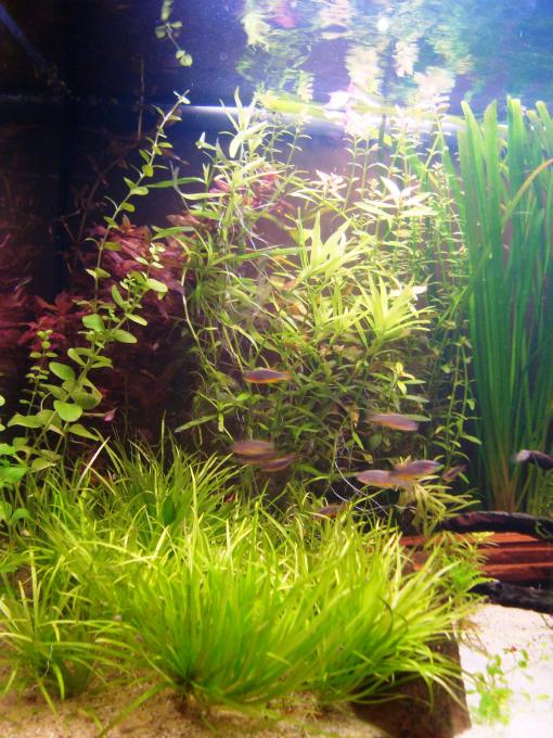 Πληροφορίες Ενυδρειο: Juwel Rekord 600 Διαστάσεις: 61 x 31 x 42 cm Όγκος: 50 λιτρα (περιπου καθαρα) Κατηγορία: Φυτεμένο Φυτά: Microsorium pteropus, Valisneria nana, Ludwigia repens, Rotala rotundifolia, Micranthemum umbrosum, Blyxa japponica, Pogostemon helferi, Echinodorus tenellus, Java moss, Christmans moss, Glossostigma elatinoides, stargrass, Limnophila aquatica, Pelia (Monosolenium tenerum), Lysimachia nummularia, Proserpinaca palustris, Rotala macrandra, Wilow moss (Fontinalis antipyretica), Cabomba furcata, Hemianthus micranthemoides. Ψάρια / ¶λλα είδη: Endlers και C.P.D. απο γαριδες πολλες red cherry και 3 amano Διακοσμητικά υλικά: Ενα ξυλο και πετρες. Αμμο για υποστρωμα Φόντο: Τιποτα (φαινεται η ξυλινη επενδυση απο πισω) Φωτισμός: 3 x 15 watt Arcadia plant growth Διάρκεια φωτισμού: 8,5 ωρες Φιλτράρισμα: Το εσωτερικο φιλτρο της Juwel (Με siporax και ενα σφουγγαρι) Θερμοστάτης: Juwel 50 watt Λίπανση: Seachem flourish trace, Seachem flourish potassium, Seachem flourish iron και fleet enema Παροχή CO2: Ναι 2 λιτρη φυαλη CO2 Παράμετροι: pH: 8 Γενική σκληρότητα (GH): 18 Ανθρακική σκληρότητα (ΚΗ): 5 Αμμωνία (ΝΗ3): 0 Νιτρώδη (ΝΟ2): 0 Νιτρικά (ΝΟ3): 15 Αλλαγές νερού: 30% ανα εβδομαδα Θερμοκρασία: 25 τωρα ομως καλοκαιρι ... φτανει και τους 27 Παρατηρήσεις: Πολλα ευχαριστω στον raven (μου χαρισε τις 2 εξτρα λαμπες -ολο το συστημα ετοιμο- μου εδωσε edler-ακια, γαριδες red cherry και πολλα πολλα κλαδεματα) και τον panos alex/polis (μου χαρισε πολλες red cherry και edler-ακια και πολλα κλαδεματα). Χωρις τους παραπανω το ενυδρειο δε θα ηταν ετσι οπως ειναι σημερα!! Φωτογραφίες (συγχωρεστε με για την ποιοτητα τους ):