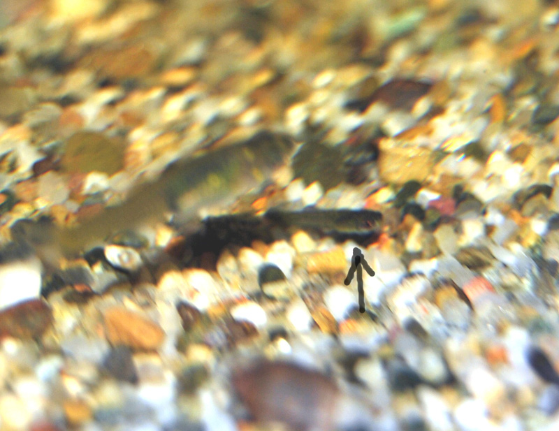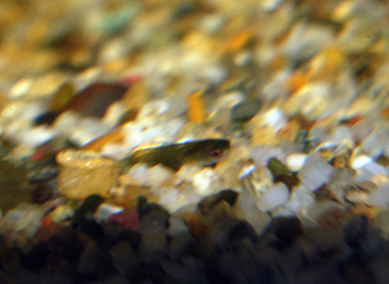 Χτες παρατηρουσα τα ψαρακια μου στην γεννηστρα 54 λιτ, και ειδα ενα παραξενο μικρο 1εκ. που κολλαγε παντα πανω στον βυθο και ηταν σκουρο, σχεδον μαυρο. Νομισα οτι ηταν κανενα απο τα νεογεννητα endlers που εριξα χτες μεσα και ειχε προβλημα. Κοιτωντας ομως με μεγενθυντικο φακο παρατηρησα οτι δεν μοιαζει με εντλερακι. Εχει κοκκινα/χρυσαφι ματακια , μικρο μυτερο ραχιαιο, ερπει παντοτε πανω σε επιφανειες, ειναι υγιεστατο και τρωει ζωντανη αρτεμια.