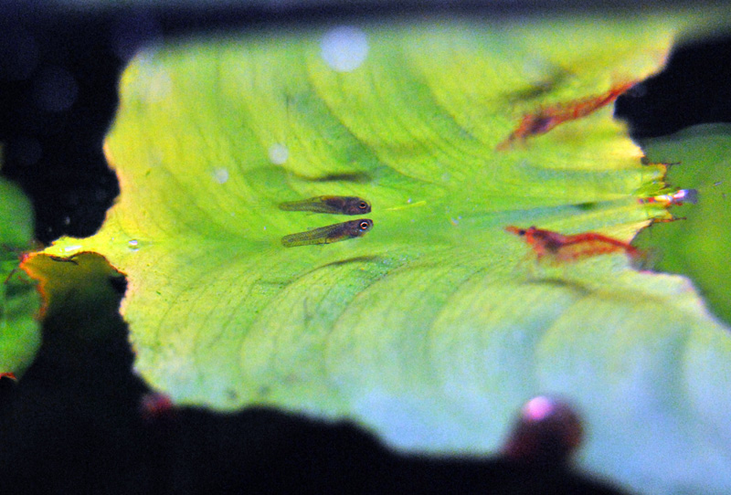 Μεσα στο ενυδρειακι ειχα 3 μωρα Pseudomugil και αρκετα εντλερακια. Τωρα βρισκω μονο 2 Pseudomugil αρα το 1 που λειπει ηταν αυτο το περιεργο ψαρακι. Ο νους μου πηγε στα goby που γεννησαν καποια στιγμη στο υφαλμυρο αλλα δεν ειχα χωρο να τα χωρισω και δεν επεζησε ο γονος.Αλλα αν ηταν goby θα ειχε βγαλει ηδη ριγες εδω και 1 μηνα που το εχω ![]() Σημερα ειναι καθισμενο πανω σε ενα φυλλο ανουμπιας κοντα στην επιφανεια (ποτε δεν κολυμπαει στα ανοιχτα). Το εβγαλα μερικες φωτο αλλα και παλι με την μεγενθυνση δεν μπορω να καταλαβω τι ειναι.. Μαλλον θα πρεπει να περιμενω λιγο καιρο ακομη για την αναγνωριση. |