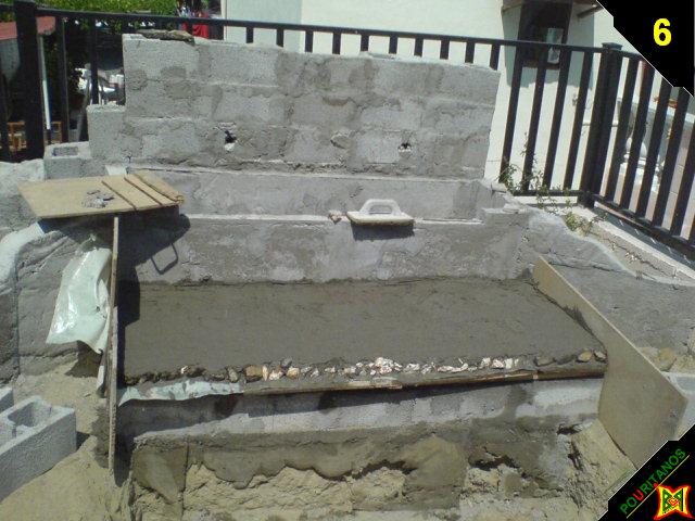 Δημιουργία του πατώματος της προλιμνης FOTO 2 Εδώ φαίνονται τα 2 σημεία που θα φέρνουν νερό στην προλιμνη Στην ουσία το τοίχος πίσω από την προλιμνης θα έχει τρύπες σε 2 σημεία για να πλημμυρίζουν την προλιμνη μια και το νερό θα έρχεται εσωτερικά από το τοιχίο. FOTO 3 Εδώ φαίνεται ο πάτος της κατασκευής. Σκοπός του είναι να κάνει ένα σταθερό δέσιμο στα σιδερά πλέγματα ώστε να μπορέσω στην συνεχεία να κάνω τα απαραίτητα καλουπώματα για τα πλαϊνά. FOTO 4 εδώ φαίνονται τα εσωτερικά και εξωτερικά καλουπώματα της προλιμνης. FOTO 5 Η προλιμνη. Αριστερά και δεξιά της ο χώρος για να μπουν φυτά εξωτερικού χώρου. FOTO 6 Προέκταση ώστε να μπορέσει ο καταρράκτης να γίνει ποιο μεγάλος. FOTO 7 Δημιουργία οριοθέτησης της λίμνης με τσιμεντόλιθους – τσιμέντο – σιδερά. FOTO 8 Δημιουργία υψομετρικό βαθμίδων μέσα στην λίμνη. FOTO 9 Δημιουργία ένος λεπτού στρώματος τσιμέντο για περισσότερη ασφάλεια (και καλά) σε περίπτωση διαβρώσεις των χωμάτων. (μπαίναμε πλέων στων χειμώνα και οι εργασίες κόντευαν να σταματήσουν) FOTO 10 Ένα γενικό πλάνο.