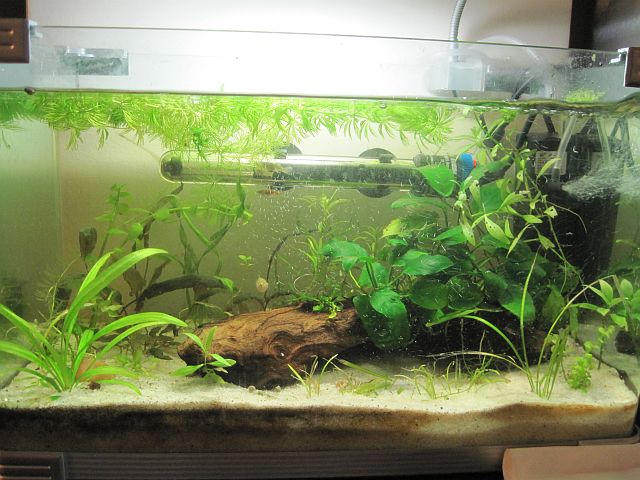 Τελευταία έβαλα και τα endlerάκια με σκοπό να κινήται κάτι μέσα. Οι γέννες θα δίνονται ΑΜΕΣΑ, και δεν αποκλείεται μόλις ενηλικιωθούν να μείνουν μόνο ένα ή δύο ψαράκια. Διαστάσεις:40Χ23Χ25,5 Όγκος:23,5 λίτρα Κατηγορία:Ότι να 'ναι Φυτά: Βαλισνέριες νάνες, σουμπουλάτα, εχινόδωρος τενέλους, ανούμπια νάνα, κόκκινες κρυπτοκορίνες, κερατόφυλλο, φακή και 3-4 ακόμη. Ψάρια / Άλλα είδη: 3Θ+1Α Endlers, μερικές red cherry, σαλιγγάρια horn. Διακοσμητικά υλικά: Ενα μοπάνι με ανουμπια νάνα και java ferm, χαλαζιακή μπέζ άμμος, 2 πετρούλες βαλσατη. Φόντο: Τοίχος Φωτισμός: 14W Διάρκεια φωτισμού: 8 ώρες Φιλτράρισμα: http://www.osmosisaquariums.gr/index...emid=1&lang=el με σπόγκο και μια γεμάτη κουταλιά της σούπας substrat pro. Παράμετροι: pH:7,8 Γενική σκληρότητα (GH):21 Ανθρακική σκληρότητα (ΚΗ):10 Αμμωνία (ΝΗ3):0 Νιτρώδη (ΝΟ2):0 Νιτρικά (ΝΟ3):2 Αλλαγές νερού: 30% εβδομαδιαία Θερμοκρασία:23 C Άλλες πληροφορίες: Θερμοστάτης: Jager 18W Λίπανση:flourish 2 φορές το μήνα αφού όλο ξεχνάω.... Παροχή CO2:οχι
