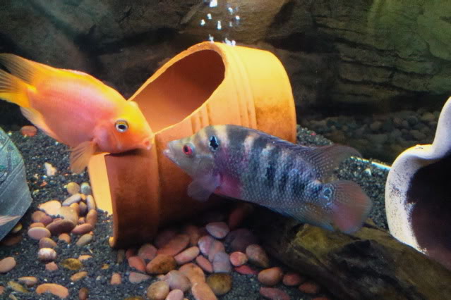 Γεια σας φιλοι, εδω θα δειτε μια μιξη ενος αρσενικου Amphilophus Trimaculatus (Trimac) με μια θηλυκια παπαγαλινα "blood parrot". Με την πρωτη τους προσπαθεια ειχαμε απολυτη επιτυχια και τα αυγα σκασανε και τα μικρα βγηκαν την 1 μαρτιου 2010. Θα ακολουθησουν πολλες φωτο απο την προοδο τους.