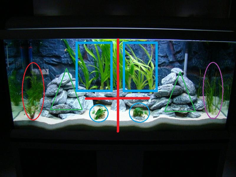 ![]() ομως το αδικεις γιατι το εκανες ΑΠΟΛΥΤΑ συμμετρικο. αν το διπλωσεις στον κατακορυφο κοκκινο αξονα (σορρυ που σου "μαγαρισα" τη φωτο) το ενα κομματι θα συμπεσει στο ιδιο απο την αλλη πλευρα. (τα εχω επισημανει με τα ιδια σχηματα εκατερωθεν). αυτη η συμμετρια του στερει τη φυσικοτητα του. μετακινησε καποια φυτα ωστε να μην ειναι στις αντιστοιχες θεσεις δεξια και αριστερα..και προσθεσε πετρες σε εναν λοφο ωστε να σηκωθει πιο ψηλα απο τον αλλο...κανε γενικοτερα καποιους ακανονιστους συνδυασμους και νομιζω οτι και εσενα θα σου αρεσει πολυ περισσοτερο πιο φυσικο. σταθηκα και εκανα το σχημα ακριβως γιατι θεωρω πολυ πετυχημενο το ενυδρειο σου εκτος απο τη συμμετρια αυτη.