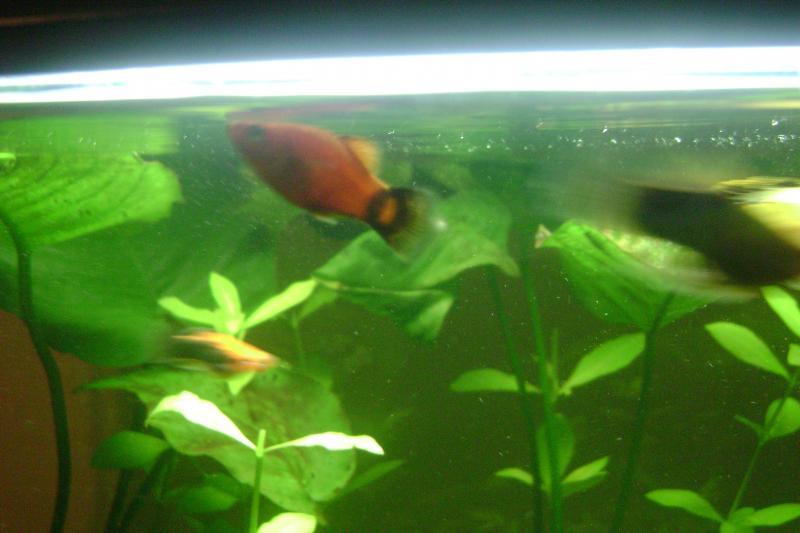 ειχα δυο μολλυ αρσενικα στο ενυδρειο μονο,το οποιο τρεχει 2 μηνες ακριβως.Αφου είδα ότι τα ψαράκια τα πάνε μια χαρά(τουλαχιστον ετσι νομίζω) ειπα να προσθεσω και τρια πλατυ πηγα λοιπον στο Petshop και πηρα δυο θηλυκα που εχουν αρκετα μαυρο χρωμα(το ενα φαινεται στh photo) και ενα αρσενικο το οποιο ειναι σχεδον κατακοκκινο. αυτο που θελω να ρωτησω ειναι το εξης ο αρσενικος τα κυνηγαει και τα δυο συνεχως.δεν τα αφηνει καθολου σε ησυχια.υπαρχει θεμα να τα τραυματίσει??επιπλεον θελω να μου πειτε αν ο διαφορετικος χρωματισμος που εχουν τα θηλυκα παιζει ρολο σε τυχον γεννητουρια η θερμοκρασια που τα εχω ειναι σε 23.5-24.5 βαθμους με Ph 8. τα δυο μολλυ που ειναι αρσενικα και μονα τους επηρεαζουν τα πλατυ? ευχαριστω εκ των προτερων αν μπορειτε και καταλαβαινετε πειτε μου αν φαινονται και υγιη τα ψαρια |