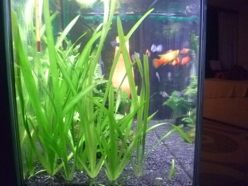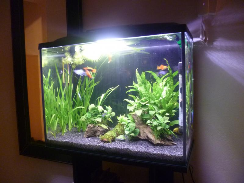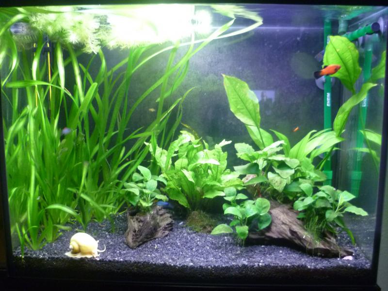 . Μετά από 6 μήνες ενασχόλησης με το χόμπι, που τους πέρασα με πολύ διάβασμα και αρκετές θα έλεγα αλλαγές στο aquascape του μικρού μου ενυδρείου, έχω πλέον καταλήξει στο συγκεκριμένο στήσιμο, που στα έμπειρα (Πληροφορίες Διαστάσεις:60 (μ) X 30 (π) X 45 (υ) Όγκος: 65 περίπου καθαρά Κατηγορία: κοινωνικό φυτεμένο χαμηλών απαιτήσεων Φυτά: βαλισνέριες, ανούμπιες, java fern, java moss (δεν πάει και πολύ καλά), λίγο κερατόφυλο Ψάρια / ¶λλα είδη: 7 ενήλικα platies (2 α - 5 θ), 3 μικρά platies 2 μηνών, 5 red cherries, 1 apple snail. Διακοσμητικά υλικά: χαλαζιακό χαλίκι, 2 πέτρες λάβα, 2 ξύλα (χαλίκι, ξύλα κ.λ.π.) Φόντο: μαύρο χαρτόνι Φωτισμός: 11w aquael, 1 μέτρο λεντοταινία cool white 14,4w Διάρκεια φωτισμού: 15:00 - 22:30 (7,5 ώρες) Φιλτράρισμα: eheim 2213 Θερμοστάτης: aquael 100w Λίπανση:- Παροχή CO2:- Παράμετροι: pH:8 Γενική σκληρότητα (GH):- Ανθρακική σκληρότητα (ΚΗ):- Αμμωνία (ΝΗ3):0 Νιτρώδη (ΝΟ2):0 Νιτρικά (ΝΟ3):10 Αλλαγές νερού:30% κάθε εβδομάδα Θερμοκρασία:26 ¶λλες πληροφορίες: Ο θερμοστάτης όταν μεγαλώσουν οι βαλισνέριες θα μεταφερθεί στην αριστερή πλευρά του ενυδρείο για να τον κρύβουν λίγο Φωτογραφία: Περιμένω τυχόν προτάσεις σας για περαιτέρω βελτίωσή του