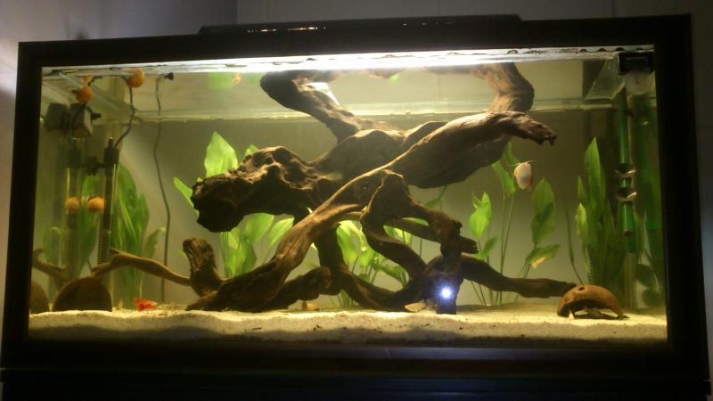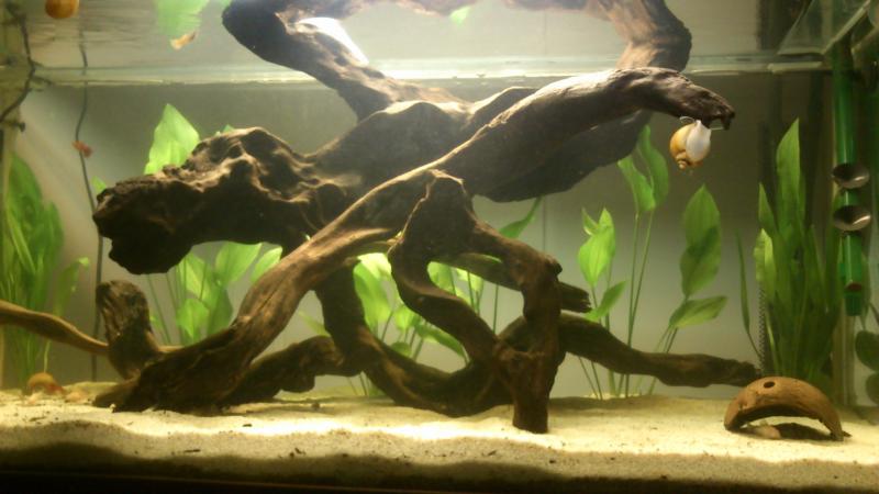 Το στησιμο ωστοσο μπορει να βελτιωθει κατα την αποψη μου. Φαινεται πολυ "φτιαχτο" με τα φυτα στην πλατη και τις ριζες στη μεση. Θα προτιμουσα τη μια μερια με ριζες και την αλλη με φυτα. Καποιες παρατηρησεις. Τα cory θα τα προτιμουσα ενα ειδος ολα. Τα ζωοτοκα με τα cory και τον ancistrus δεν ειναι καλος συνδυασμος. Το CO2 δεν ειναι απαραιτητο για αυτα τα φυτα (χωρις να κανει κακο ομως), ο σιδηρος ομως μπορει να φερει αλγες. Το 2213 φτανει για την ιχθυοφορτωση, αλλα η κυκλοφορια του νερου μεσα στο ενυδρειο στηριζομενη μονο στην αντλια του, πρεπει να ειναι ελλειπης. Καρυδα ασε μονο τη μια για τον ancistrus, την αλλη βγαλτη γιατι θα καλομαθουν να χωνονται τα cory και δεν θα τα βλεπεις. Ωραιες τροφες. Προσεχε μονο να μη τρωει πολυ πρωτεινη ο ancistrus (αν ειναι ο συνηθης που πουλανε cf. cirrhosus - πρωην Sp3) γιατι θα εχει προβλημα με το εντερο του. Ειναι αποκλειστικα φυτοφαγος.