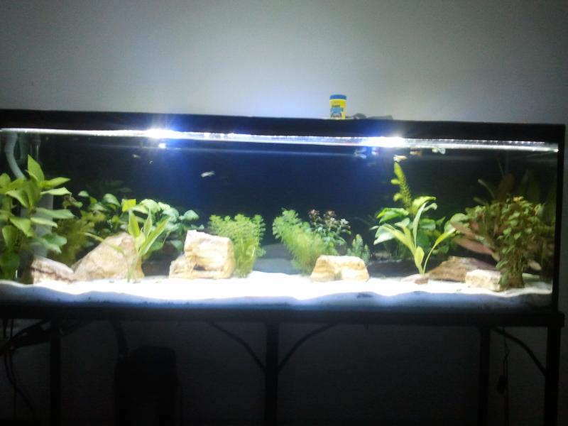 Διαστάσεις: 1.50 x 50 x 50 Όγκος: 375L μικτά Κατηγορία: Φυτεμένο Φυτά: Anubias, Ludwigia repens, Ceratophyllum demersum, Echinodorus, hygrophilla και άλλα διάφορα από τα οποία δεν θυμάμαι ακριβώς τα ονόματα τους Ψάρια / ¶λλα είδη: Guppies, Xiphophorus, SAE, Διακοσμητικά υλικά: Μη αβεστολιθικές πέτρες, άσπρη άμμος μη ασβεστολιθική (χαλίκι, ξύλα κ.λ.π.) Φόντο: Μαύρο χαρτόνι Φωτισμός: DIY LED Διάρκεια φωτισμού: 14:30 - 24:00 Φιλτράρισμα: Marathon 2000 + Εσωτερικό φίλτρο Θερμοστάτης: 300W Λίπανση: Υγρό λίπασμα Παροχή CO2: Όχι ακόμα Παράμετροι: pH: 7.4 Γενική σκληρότητα (GH): Ανθρακική σκληρότητα (ΚΗ): Αμμωνία (ΝΗ3): 0 Νιτρώδη (ΝΟ2): 0 Νιτρικά (ΝΟ3): 5 Αλλαγές νερού: 30% κάθε εβδομάδα Θερμοκρασία: 26 ¶λλες πληροφορίες: Φωτογραφία: Το ενυδρείο τρέχει σχεδόν ένα μήνα και μπήκε έτοιμο στρωμένο βιολογικό υλικό από το προηγούμενο 120άρι μου. |