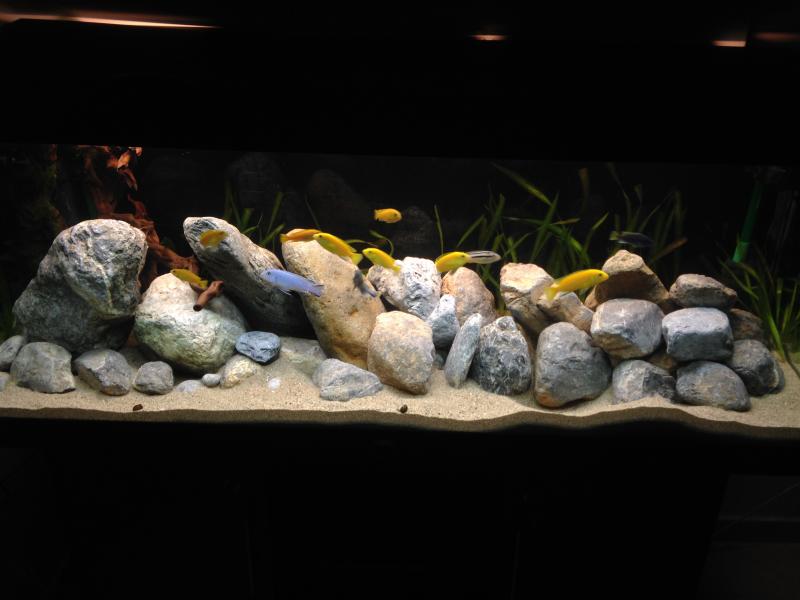 Διαστάσεις:151x51x66 (Rio 400) Όγκος:450l Κατηγορία:Malawi Φυτά:Valisneria gigantea , Java moss Ψάρια / ¶λλα είδη:4 Labidochromis caeruleus , 4 Metriaclima estherae "red zebra" , 1 ζευγάρι Melanochromis auratus , 1 Pseudotropheus socolofi , 6 Pseudotropheus sp."Acei , 2 neritina natalensis snail Διακοσμητικά υλικά: Πέτρες , 3 ρίζες driftwood , ¶μμο θαλάσσης Φόντο :Μαύρη μεμβράνη Φωτισμός: Τ8 2χ36w 1 6500k Μπροστά , 1 3500k πίσω Διάρκεια φωτισμού:8 ώρες Φιλτράρισμα: Eheim 2217 (1000lt),eheim ecco pro 2236(750lt),Eheim pro II 2036(950lt), εσωτερικό Juwel (Μηχανικό φιλτράρισμα ) (600lt) 2 κυκλοφορητές 6000lt & 3000 lt Θερμοστάτης:150w & 300w, Ιχνοστοιχεία : Seachem Cichlid Lake Salt , Σόδα Παροχή CO2: Όχι Παράμετροι: pH: 8.2 Γενική σκληρότητα (GH):12 Ανθρακική σκληρότητα (ΚΗ):10 Αμμωνία (ΝΗ3):0 Νιτρώδη (ΝΟ2):0 Νιτρικά (ΝΟ3):5 Αλλαγές νερού:35% Κάθε εβδομάδα Θερμοκρασία:23-25 ¶λλες πληροφορίες: φελιζόλ dow Φωτογραφία: