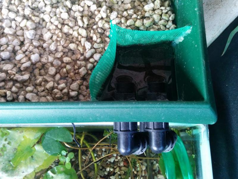 Εδώ όπως ήταν στα τέλη Οκτωβρίου Στην είσοδο μπήκε καλαθάκι με ενυδρειακό βαμβάκι Στις επιστροφές μπήκαν ρακόρ και κομμάτια σωλήνα γιατί έκανε πολύ θόρυβο το νερό που έπεφτε από ψηλά. Έβαλα και ένα κομμάτι σίτα πλαστική για να προσατεύονται από τυχόν φύλλα και άλλα σκουπίδια που θα μπορούσαν να τις φράξουν. Έτσι είναι σήμερα (η ποντεδέρια έχασε τα φύλλα τελείως αλλά νομίζω θα ξαναπετάξει την άνοιξη). |
